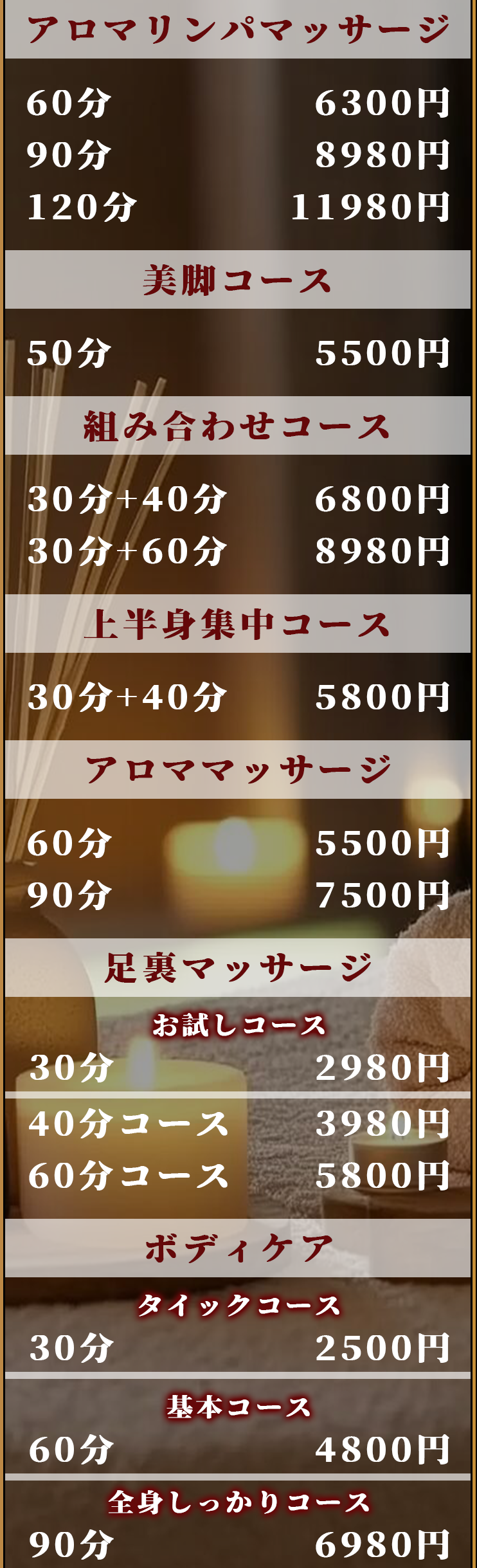 当店では、アロマオイルの効能と当店自慢のセラピストによるリンパマッサージの相乗効果による、癒しのひとときをお客様お一人お一人にお届けしております、自然で心やすらぐ優美な香りを、施術中はもちろんご帰宅お休みになってから翌日朝目覚めでまで楽しんで頂けます、どうぞゆっくりご堪能ください。